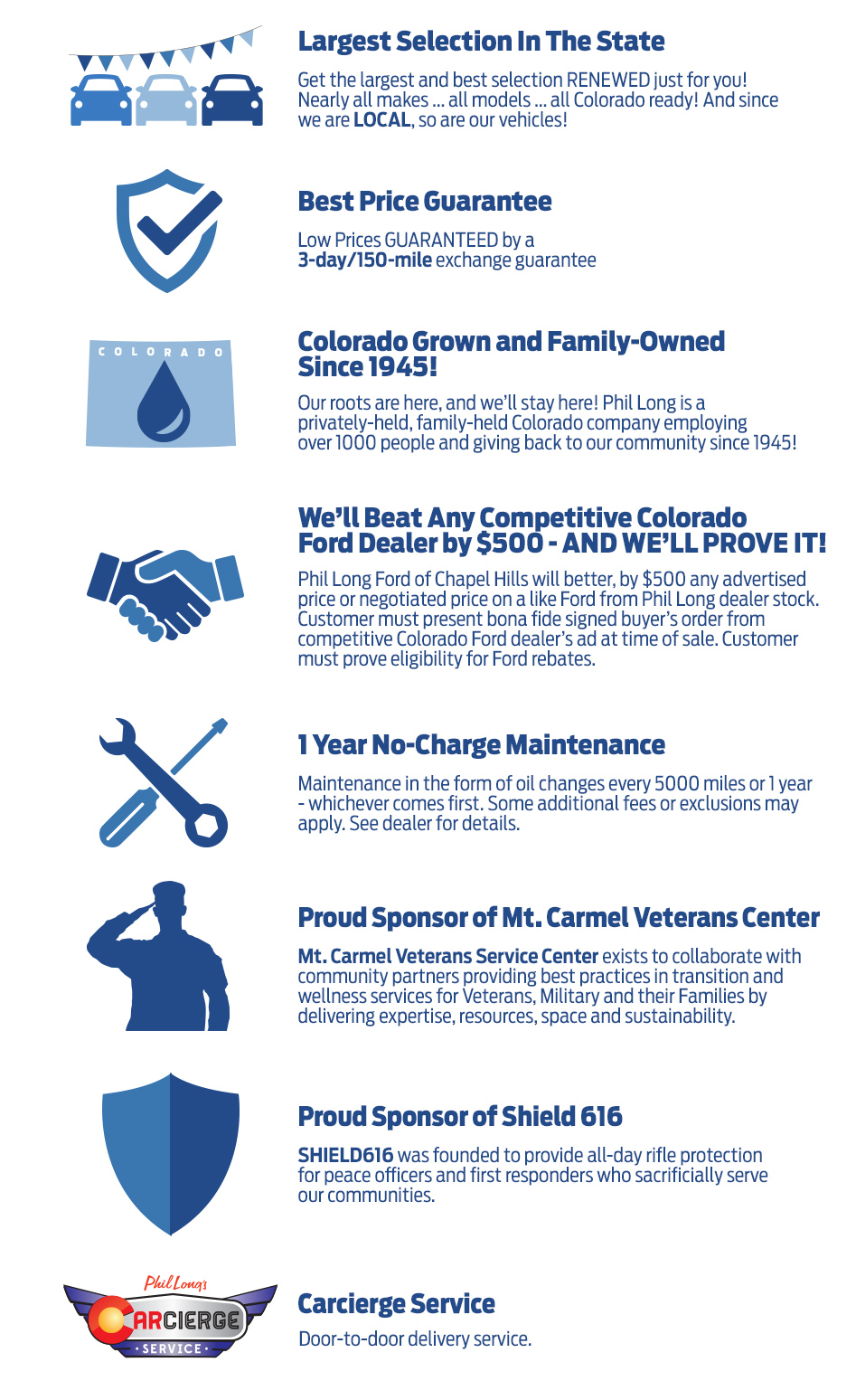 Phil Long Ford of Chapel Hills - Colorado Springs CO 80920 Phil Long Ford of Chapel Hills 42 556 Verified Reviews 9796 Favorited the service shop Sales 719 752-2597 Service 719 398. Quick Lane at Phil Long Ford of Chapel Hills 1565 Auto Mall Loop. New vehicles listed at MSRP less.